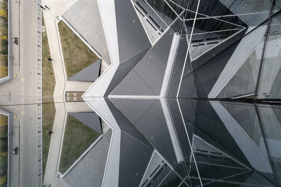 建筑朝北的較短立面俯瞰樹林,完全是玻璃,因此提供了最大的透明度;它的暴露允許更大的滲透性,增加了建筑與周圍環(huán)境的關(guān)系。對自然空間的感知是盡可能的直接。該建筑從一個基地升起,下面是兩個地下停車層。創(chuàng)造一個幾何空間,從這里可以看到周圍所有的建筑,在建筑入口處開發(fā)的新空中廣場與附近的地鐵站相連。