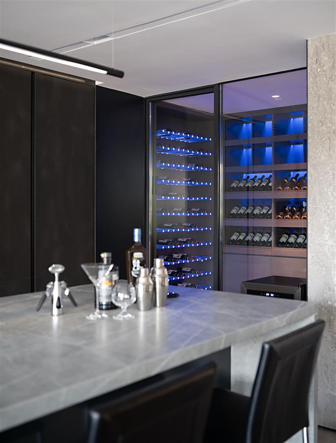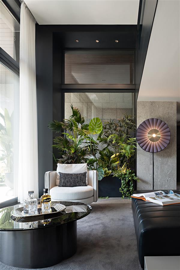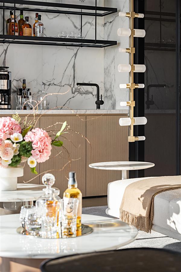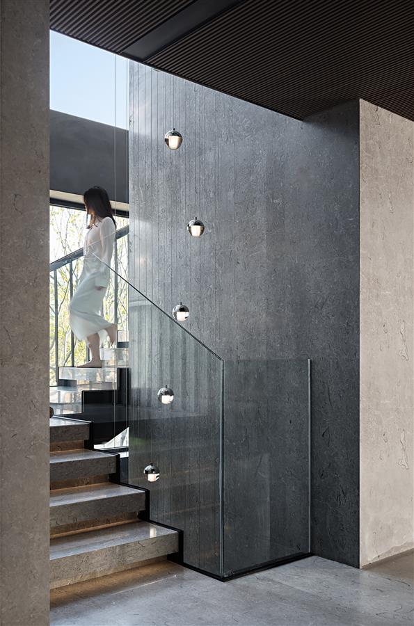 “水之墅”共5層,其中1樓挑高約6米,帶夾層,如此開闊的大宅尺度,如此立體的縱深結(jié)構(gòu),為設計師后續(xù)的生活構(gòu)景和藝術(shù)布設留下了自由的可能性?!叭绾卧诠δ苤?,構(gòu)建出能觸達居者內(nèi)心期許的生活場景,是我們的深度追問。最終以設計來回應追問,解答自然、藝術(shù)與生活的共生關(guān)系,在精神的契合中達至格局的共鳴?!?/p>