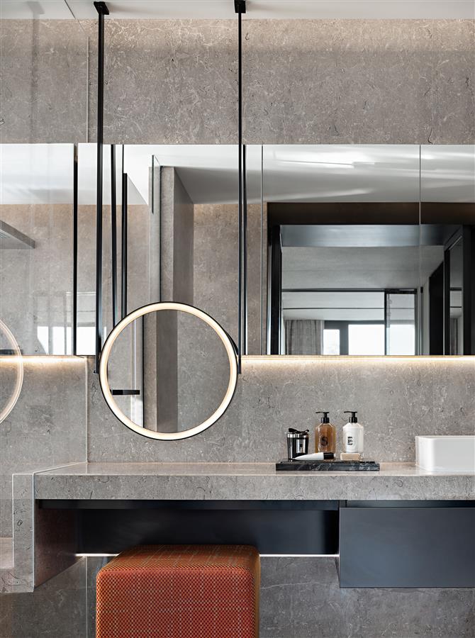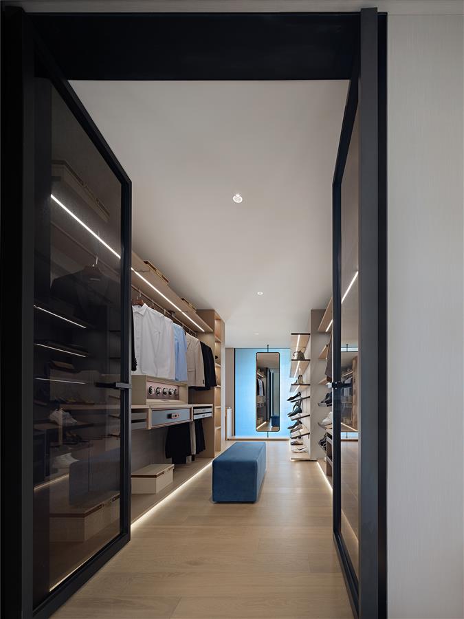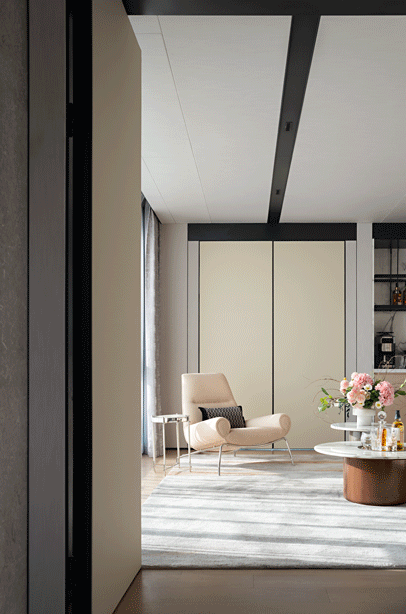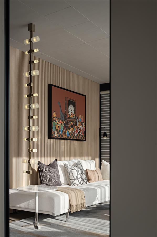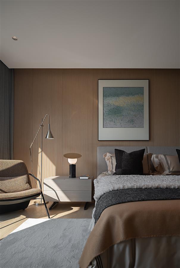 “藝術(shù)從生活中來,是一種觸手可及的美學溫度,同時藝術(shù)是有鋒芒的,我們希望借由藝術(shù)構(gòu)建生活與詩意之間的橋梁,橋接居者的氣場和日常的儀式感?!彼囆g(shù)顧問Simon如是道。木藝為簾,在主臥空間的休憩與休閑之間劃下了分隔符,隔而不斷的是空間的溫情,以及若隱若現(xiàn)的藝術(shù)意境。