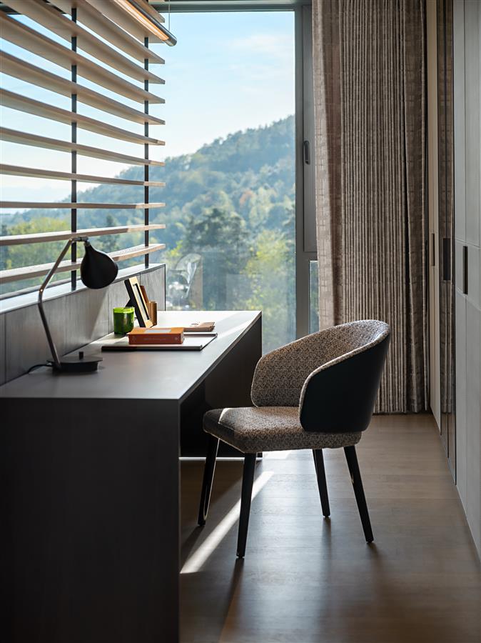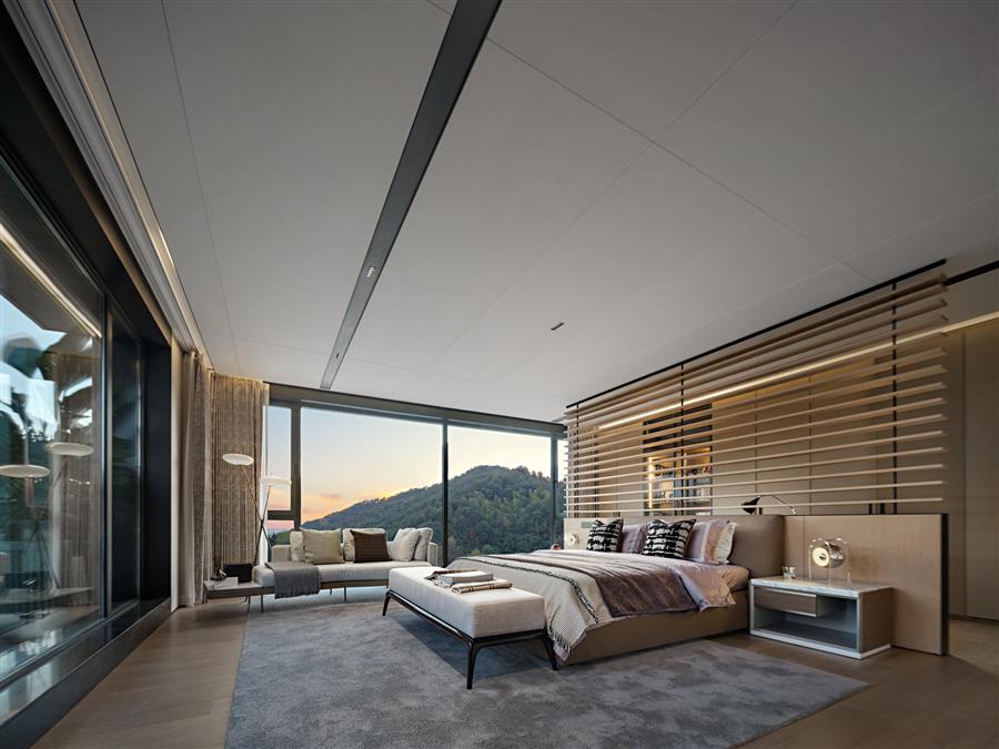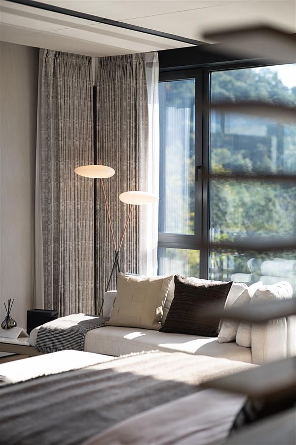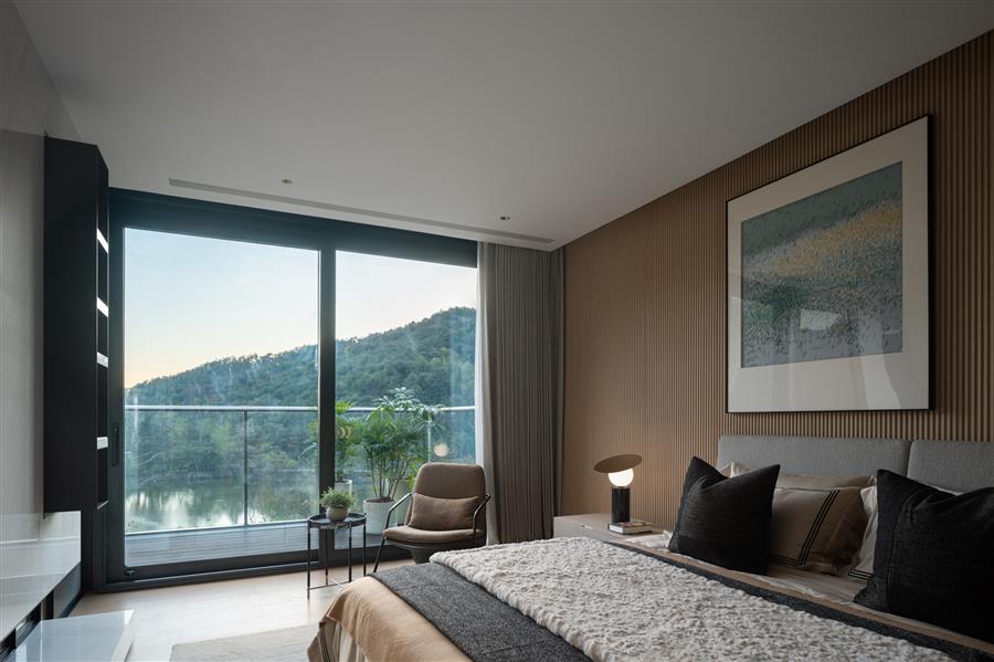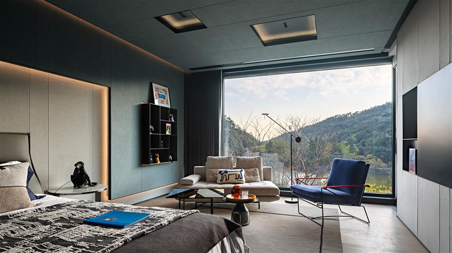 全景舒展的湖山景觀,是設計師對別墅空間節(jié)奏的感知。駐足于起居室,人的視野便攬納了綿延山景,臨窗往外望,翠意入懷,盡得自在。設計師以光影、材料、線條交織出靈動的空間韻律,演變出閑適的生活場景,讓愉悅的氛圍浸染一室。