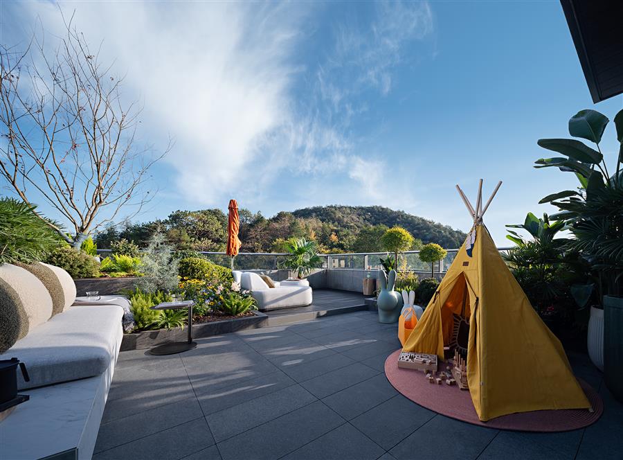 山間鳥鳴聲聲,湖邊流水潺潺,戶外露臺銜接著距離最近的自然風光,讓親近自然成為一種日常。天朗氣清時,露臺的多元功能高度實現(xiàn)生活的儀式感,無論是一杯咖啡的閑暇獨處,或是三五好友的party歡聚、三代同堂的山畔露營......白天有朝夕的生機,夜晚有星月的光輝,趣味盎然的生活情景感,在這里生根發(fā)芽。