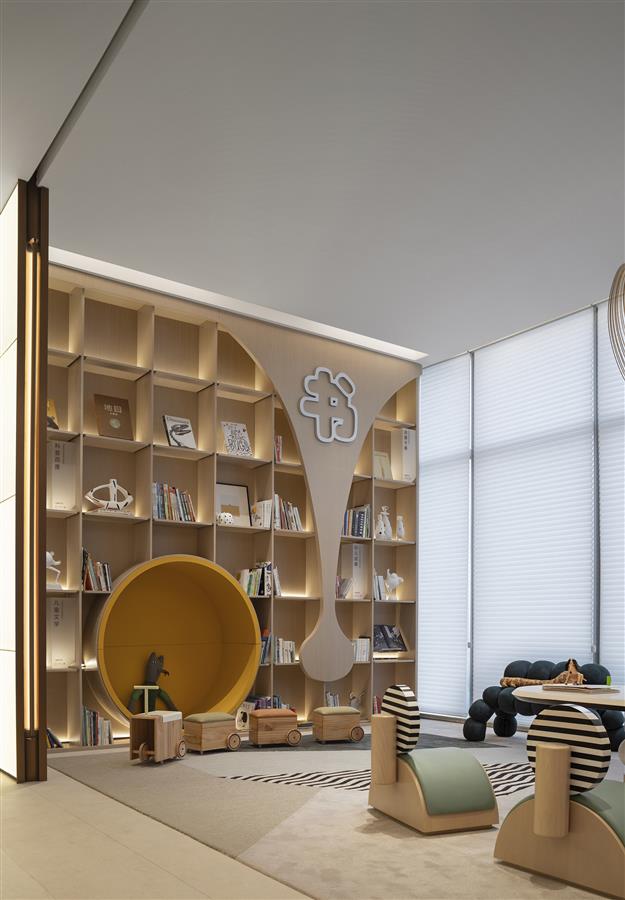 游走至空間的另一側(cè),是一處趣味十足的親子游樂區(qū)?!霸谶@里,我們將重點落于寓教于樂。不同類型的書籍、手繪的卡通插畫、可愛的卡通玩偶,皆呼應(yīng)著兒童的興趣關(guān)注點,引導(dǎo)著人們在日常的家庭互動間,遇見生活的美好?!?/p>