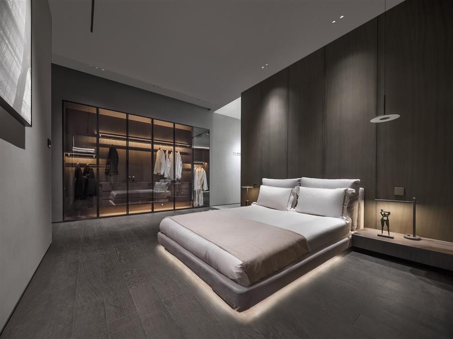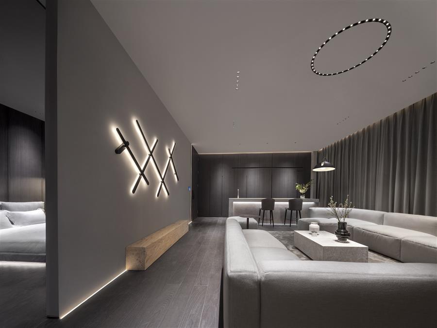 在WED中熙設(shè)計(jì)看來(lái),展廳作為品牌方與消費(fèi)者之間的媒介,如何表現(xiàn)隱藏在展示背后的品牌屬性,并在二者間創(chuàng)造對(duì)話,是達(dá)成商業(yè)目標(biāo)的重點(diǎn)。在智能住宅展示區(qū),設(shè)計(jì)師將重點(diǎn)落于舒適、優(yōu)雅與簡(jiǎn)約,結(jié)合木材、肌理漆等細(xì)膩的材質(zhì)以及不同產(chǎn)品的特性,嘗試表達(dá)燈光的氛圍與意義。