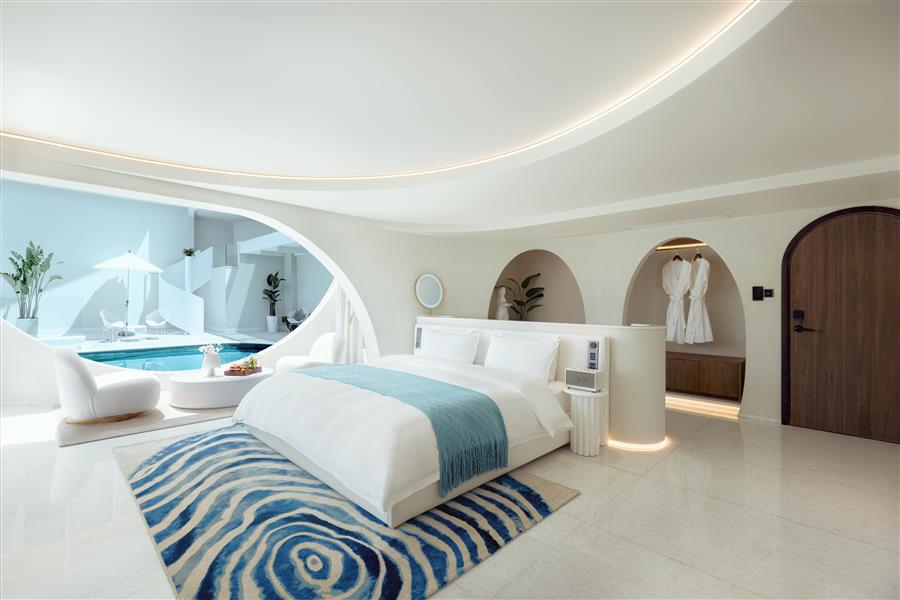“明月”的內(nèi)部是客房,明月本身是客房望向景觀庭院的取景框,在這純凈的暖白色空間中點綴海洋藍,明快的開展度假生活。可以在月下慢慢的讀本書,也可以在月下舒緩的泡個澡,洗盡這一路風(fēng)塵。