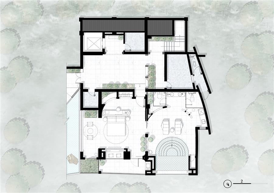 亦或是一條斜坡走道穿過中心水院,連接起兩棟樓的交通,旅客沉浸水院之中由低到高緩緩向圓滿的月亮走去。此時水院、月亮與人三者相互對話著,水院托舉著明月,連同著訪客共同組成一道內(nèi)在的景致。