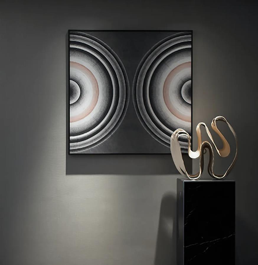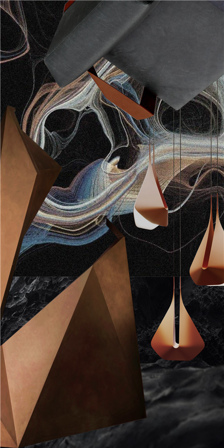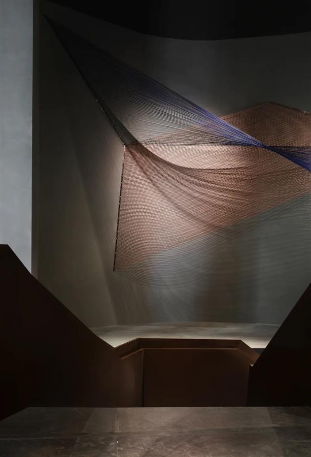 設(shè)計(jì)師巧妙運(yùn)用大理石塊面來(lái)塑造沙盤底座的冷硬感,同時(shí)不拘于隨類賦彩的匠法,加之星河涌動(dòng)的光芒意象,讓硬裝結(jié)構(gòu)的識(shí)別度更加清晰,在紛揚(yáng)碰撞后又是一番高岸深谷的藝術(shù)轉(zhuǎn)場(chǎng)。