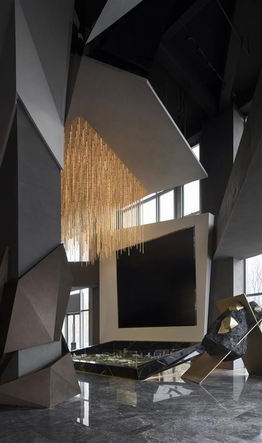 設(shè)計(jì)師以立體化的空間思維塑形硬裝,圍繞著金屬體塊的質(zhì)感延展動(dòng)線的流向,完成從接待大廳、沙盤區(qū)、洽談區(qū)、水吧臺(tái)到VIP室等的功能轉(zhuǎn)換。凌駕于工藝和手法之上的,是不規(guī)則性塑造的材料向心力,本案的硬裝構(gòu)造從形制到材質(zhì)都表現(xiàn)出全面統(tǒng)籌的水平。設(shè)計(jì)跳脫出常規(guī)工藝的束縛,以隔而不斷的裝置界面,裝點(diǎn)著硬裝的邊界感,碰撞出具象化的人文棱角。