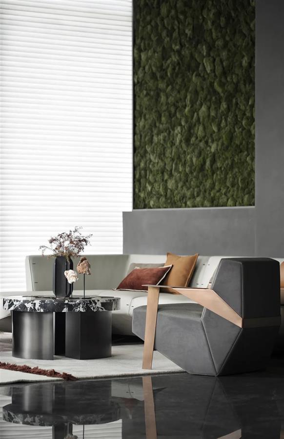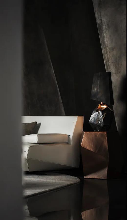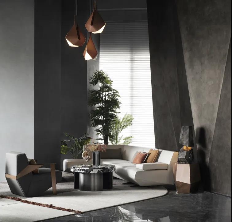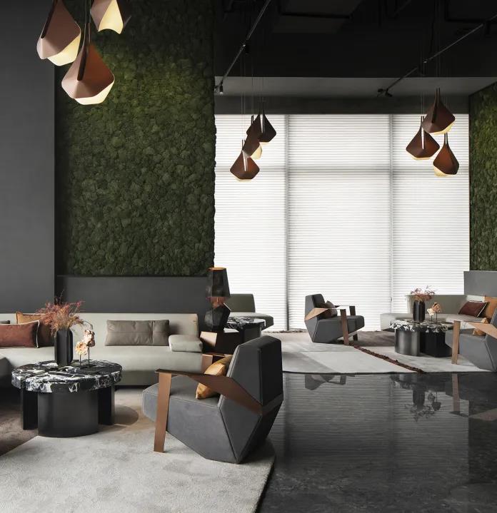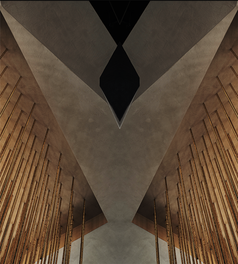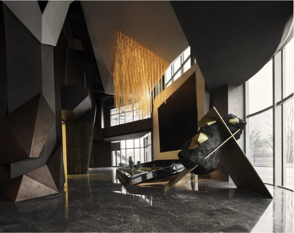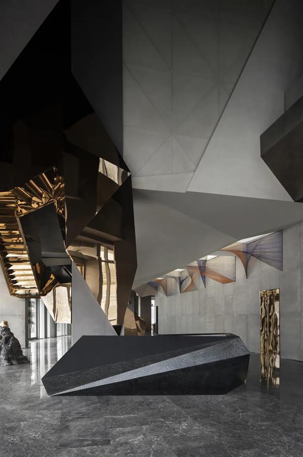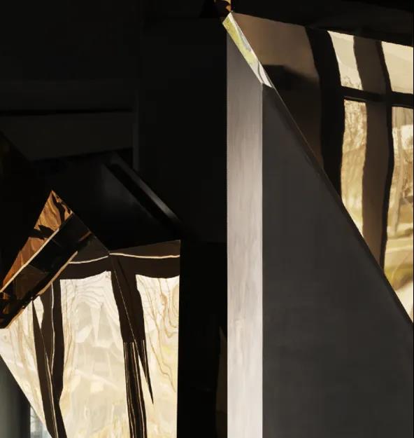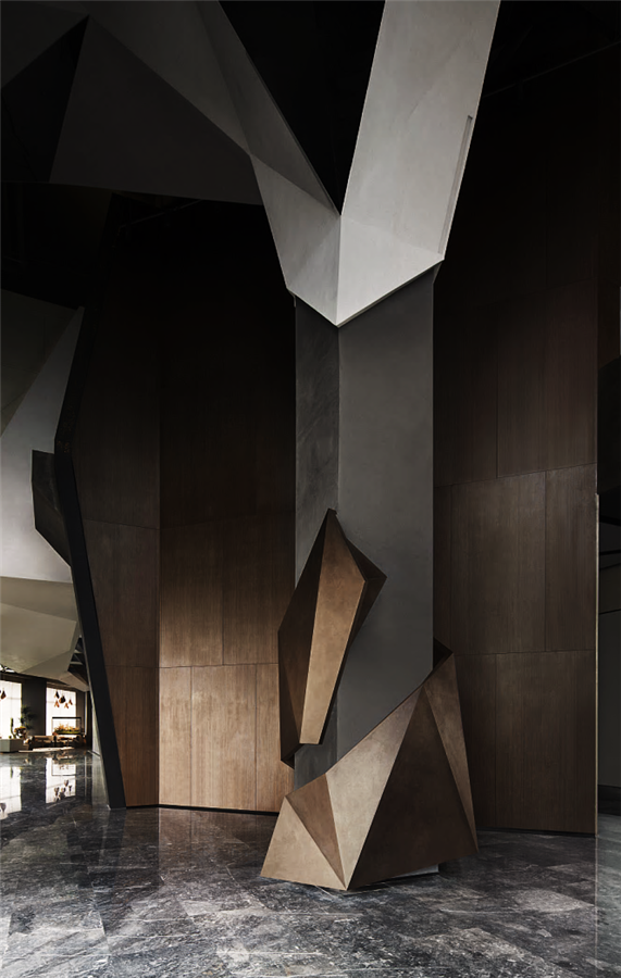 在鄰窗而立的洽談區(qū),不同寬幅的落地玻璃窗讓光的進(jìn)入有了新的路徑,商務(wù)洽談、休閑會(huì)友的功能性得以在規(guī)整有序的硬裝格局中展開(kāi)。金屬與鉆石切割的玻璃,鋪開(kāi)硬裝材質(zhì)的結(jié)構(gòu)化表達(dá)。而墨灰調(diào)墻體與地面的一致性,在金屬細(xì)節(jié)的點(diǎn)綴下連貫為空間的不規(guī)則造型,并銜接起內(nèi)外遞進(jìn)的層次感,將人引入歷史與未來(lái)的想象勝境。