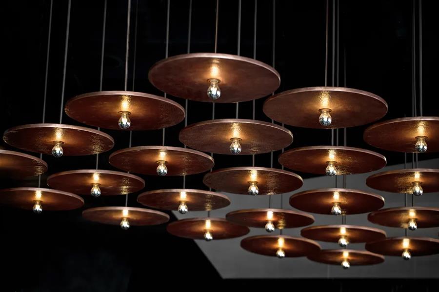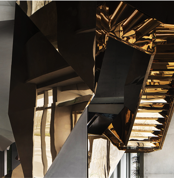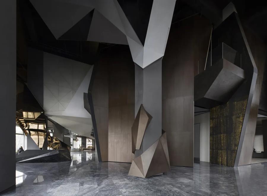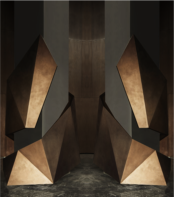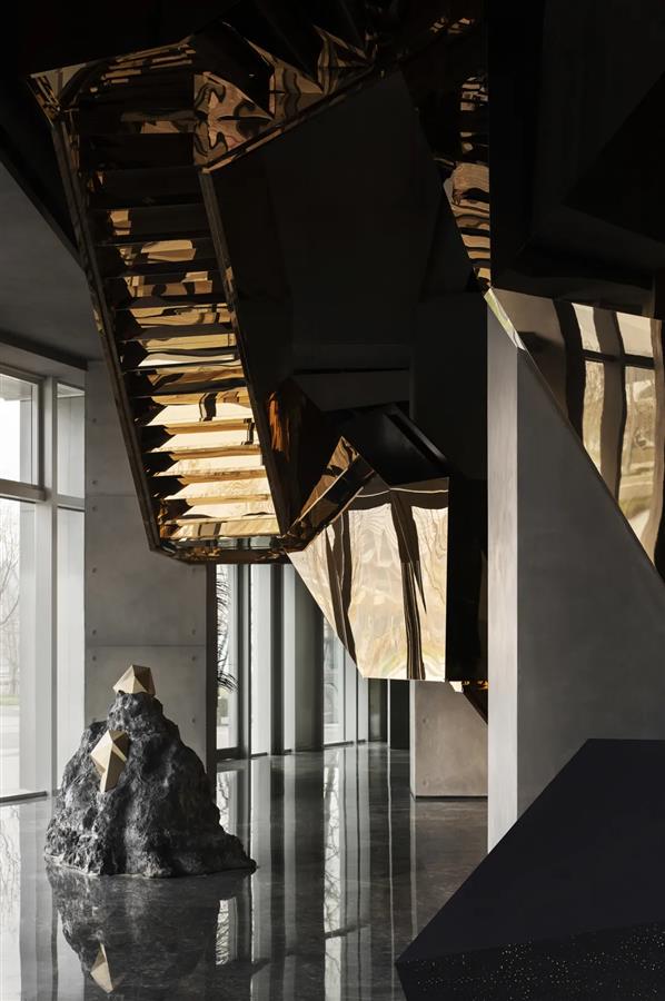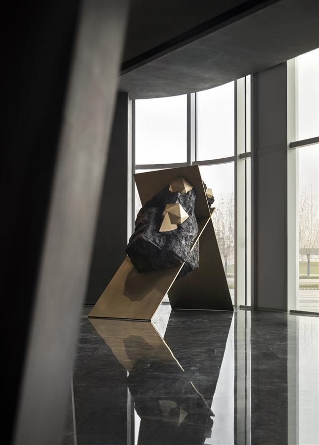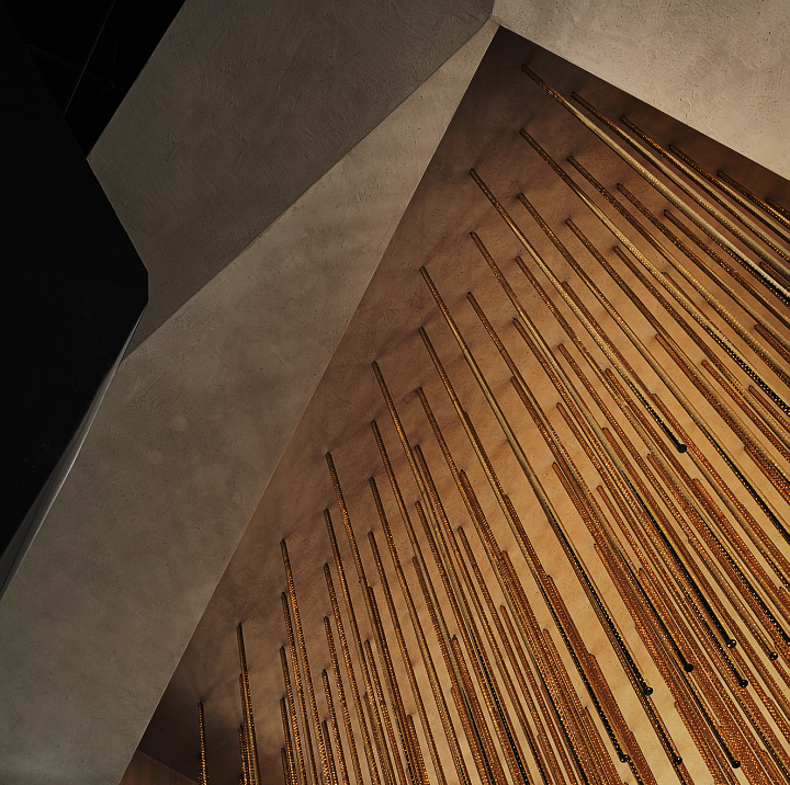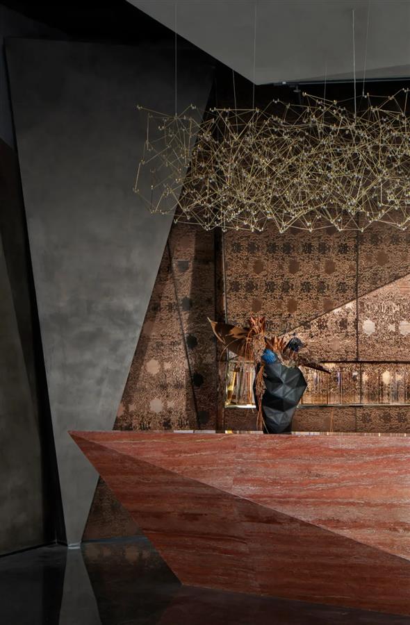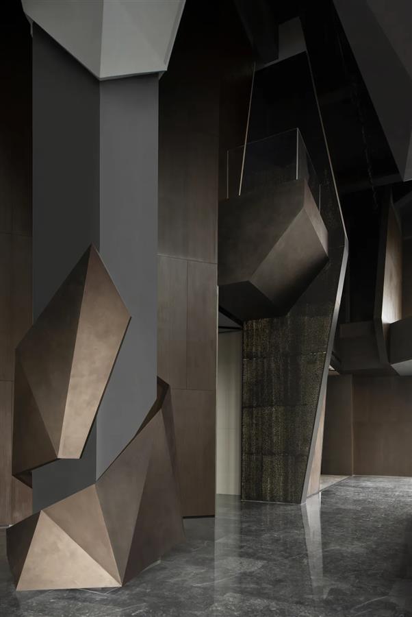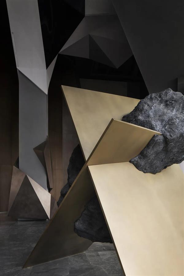 宇宙隕石的棱角,在做舊金屬的切分中,呈露出強(qiáng)烈的金石對(duì)比度,潛移默化中凸顯著硬裝層面的秩序性,宏大與細(xì)節(jié)盡顯。布魯盟設(shè)計(jì)對(duì)硬裝的塑造不止于功能優(yōu)化,更于光影隱現(xiàn)中堆疊結(jié)構(gòu)關(guān)系,在體塊的力量感、線條的柔和度里以材賦形,表達(dá)歷史元素中的靈動(dòng)個(gè)性與無(wú)限創(chuàng)意。
