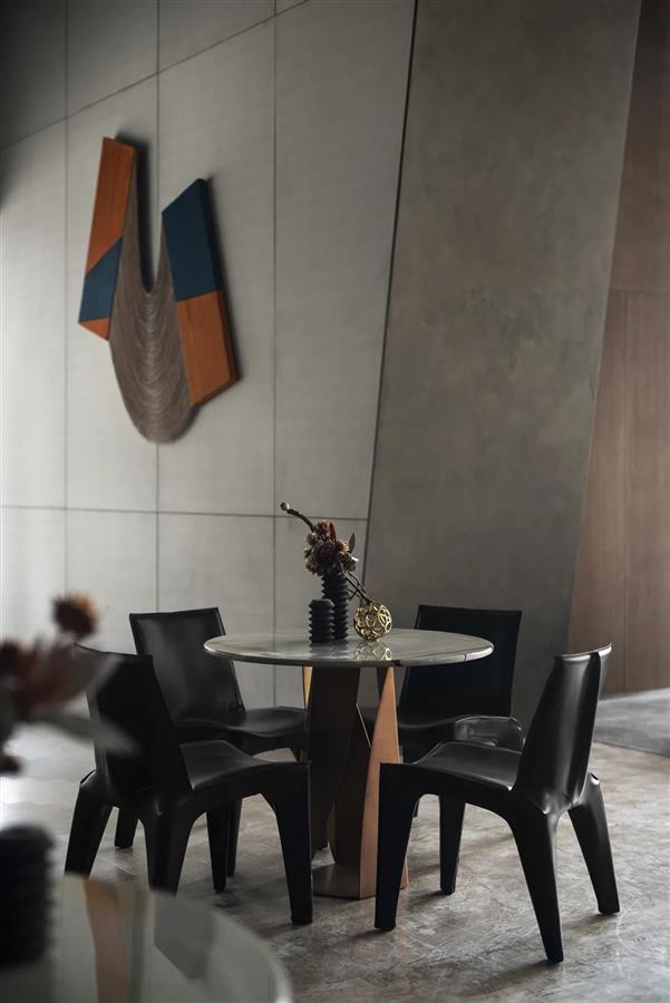 挑高格局之中,不規(guī)則天花體塊與墻體造型透過(guò)硬裝手法的豐富性,在材質(zhì)的和諧里打破穩(wěn)定的節(jié)奏。在硬裝上解構(gòu)體塊,在軟裝上融入柔性,布魯盟筆下的的空間呈現(xiàn)出星芒流轉(zhuǎn)、詩(shī)意如瀑的藝術(shù)畫面。自頂部向下延伸出不規(guī)則的立體塊面,呼應(yīng)著空中垂掛的金色銅制燈管,特立獨(dú)行的場(chǎng)域氣質(zhì)順沿動(dòng)線轉(zhuǎn)換而深入每一處。