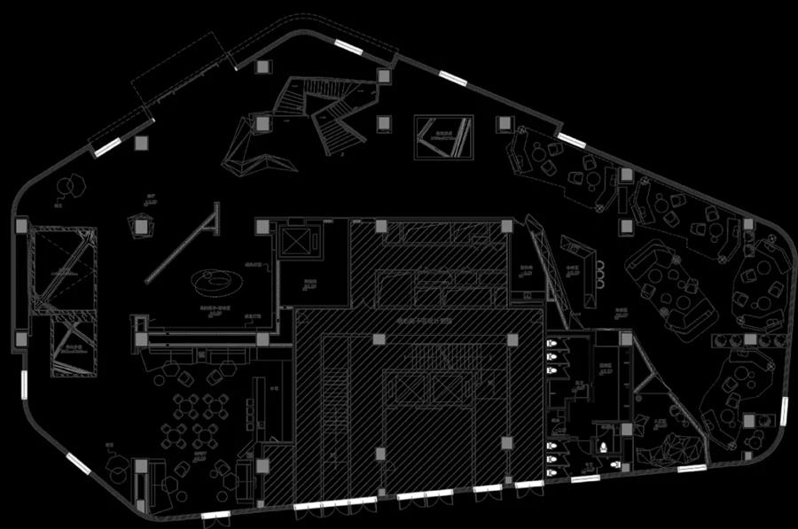 層層階梯,幾何轉(zhuǎn)折,在混凝土材質(zhì)與隱形燈帶的完美配合中,硬裝的功能性和利用率盡顯,直抵場(chǎng)景的多元價(jià)值。硬裝的布局關(guān)系與建筑原型共振,從灰色體塊到幾何造型,設(shè)計(jì)師將大氣的硬裝結(jié)構(gòu)經(jīng)驗(yàn)化形于扶手鏤空處的燈帶、材料的不透明性,予人實(shí)實(shí)在在的觸覺(jué)感知。