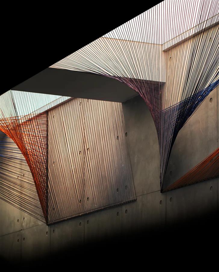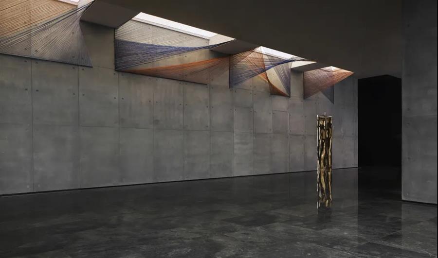 粗糲質(zhì)感的清水混凝土,構(gòu)成了品牌廊與沙盤區(qū)的硬裝基底,縱向的過(guò)道式格局則為后續(xù)的思路概念鋪墊結(jié)構(gòu)上的韌性。設(shè)計(jì)師大膽保留建筑原型中的梁結(jié)構(gòu),引入外部光線提亮混凝土墻面與大理石地面的灰色調(diào),讓場(chǎng)景更顯透視效果 —— 當(dāng)光源在線條之間被分隔,紫與橘的絲綢之線,成為人文的具象表演,延展無(wú)限的精神想象。