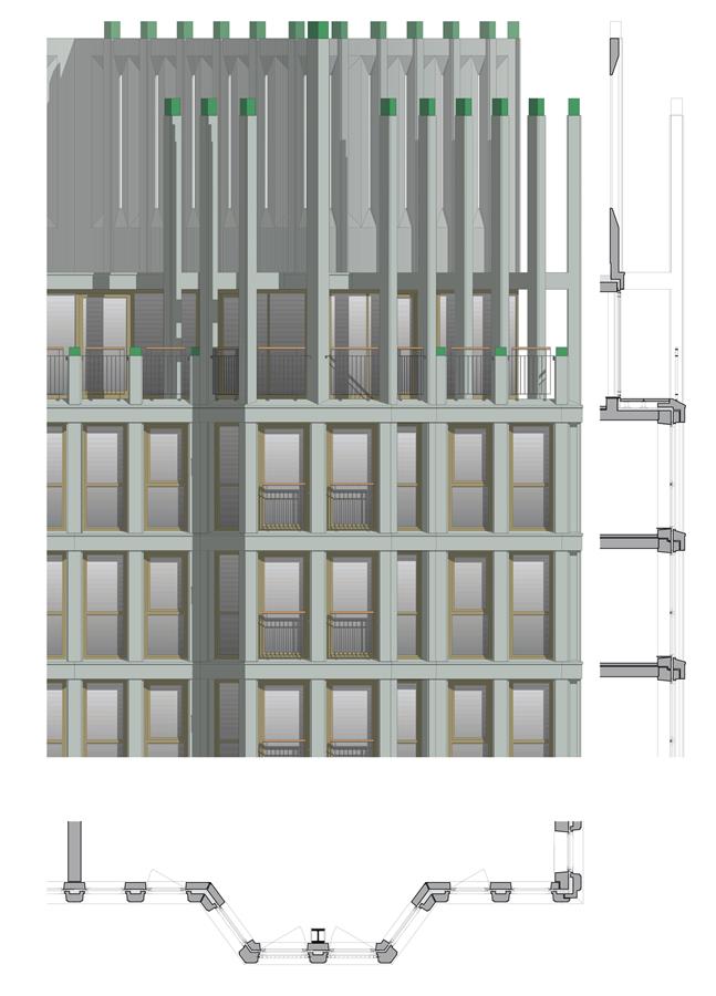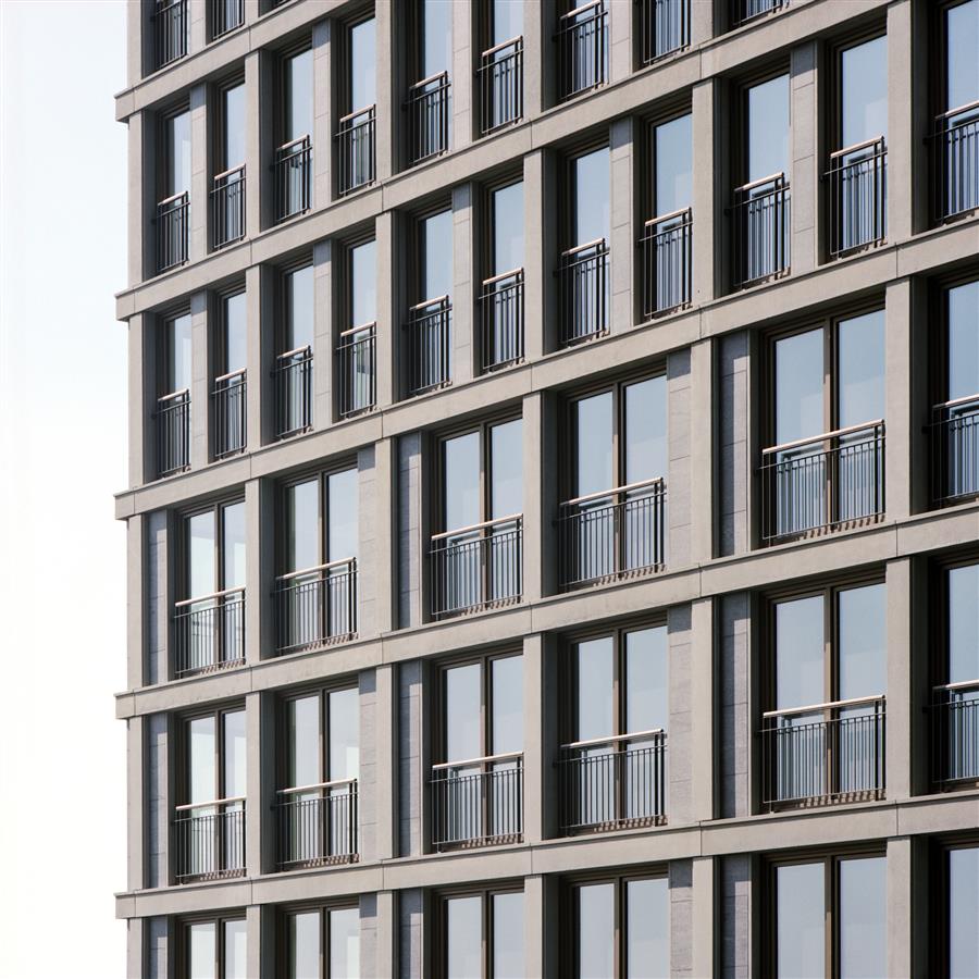 與公寓的高度相適應(yīng),采用了不同的窗戶類型。低層有薄薄的法式陽臺(tái),面向城市街道生活。在30米以上的高度,與街道的聯(lián)系消失了,公寓有較大的窗戶。在高層,盡管有強(qiáng)風(fēng)的影響,但凸窗使室外空間成為可能。由于外墻幾乎完全由玻璃制成,居民可以完美地享受風(fēng)景。不同的窗戶類型被整合到水平和垂直的混凝土結(jié)構(gòu)元素的礫石中。綠色火焰花崗巖的水平護(hù)欄和垂直側(cè)線以一種俏皮的方式使立面充滿活力。