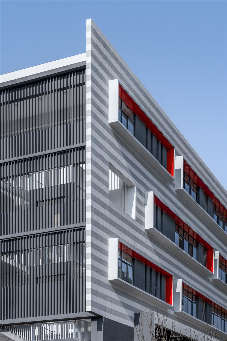 沿著應(yīng)家山路往西,一座長(zhǎng)約百米的現(xiàn)代風(fēng)格的“大城”印入眼簾,白色斑馬紋立面上“漂浮”著紅色的水平向長(zhǎng)窗和綠色的交通空間,簡(jiǎn)潔的灰白條紋真石漆和紅色的窗框的組合,透露出靈動(dòng)和童趣,打破了建筑體量給沿街立面造成的壓迫感。