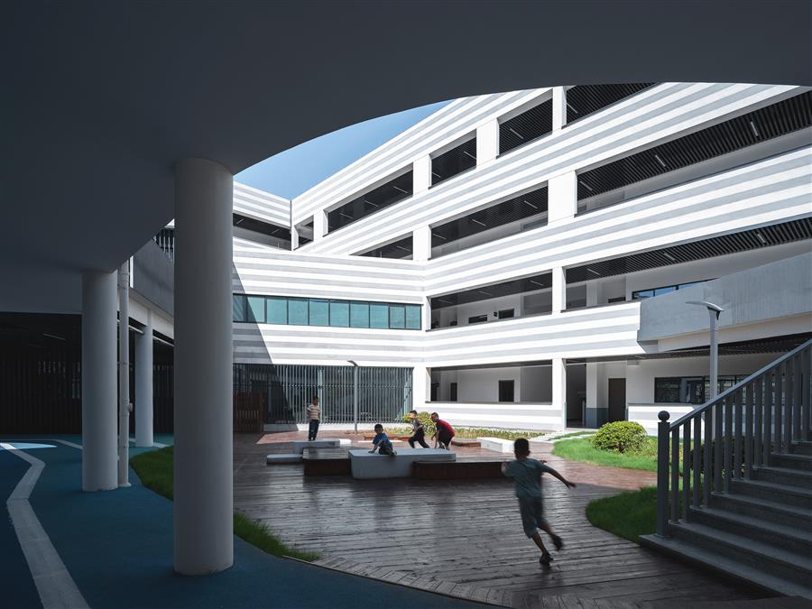 The U-shaped main building forms a boundary with the city and a huge introvert courtyard, creating a "small courtyard", a micro park exclusively for the children.