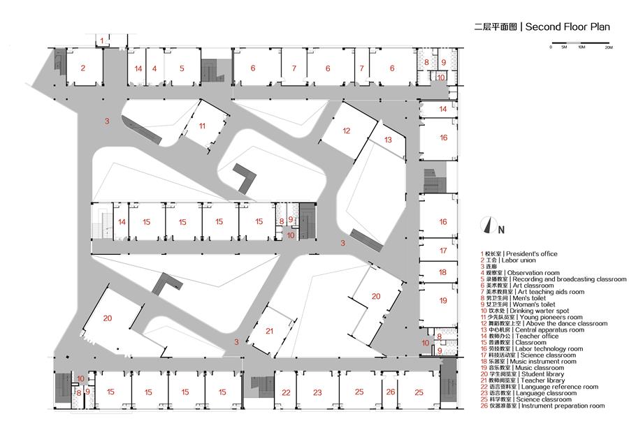 The circulation grid of the "Small Courtyards" was rotated by 30 degrees and then connected with the U shape of the "Big City", creating a more dynamic journey within the linear corridors on the first and second floors. The circulation for students is then changed from single line to a network with different scales and interweaving connections, offering highly diversified experiences of the campus. The corridors, which are pedestrian channels and public spaces, have greatly improved the playfulness of the journey.