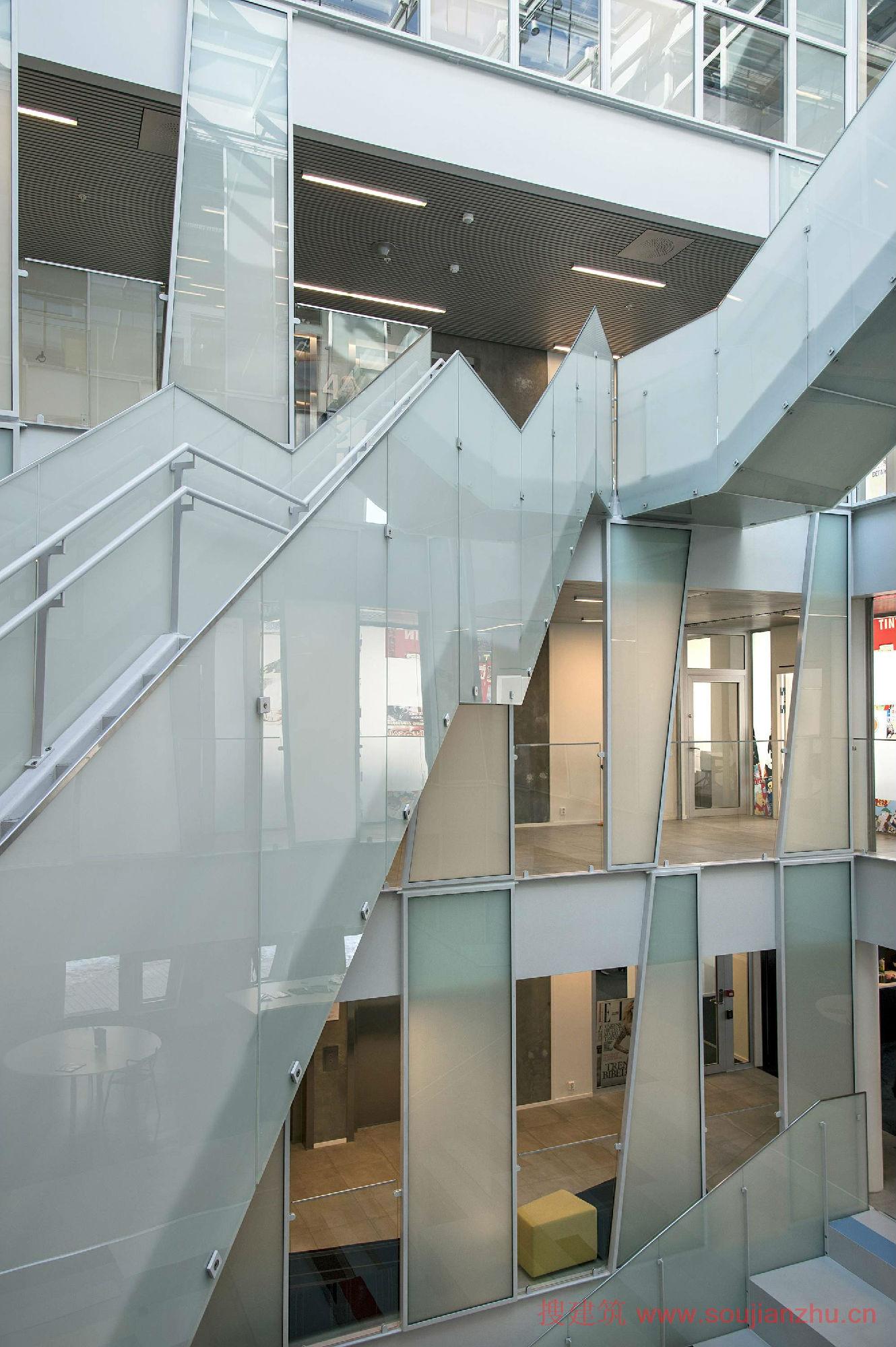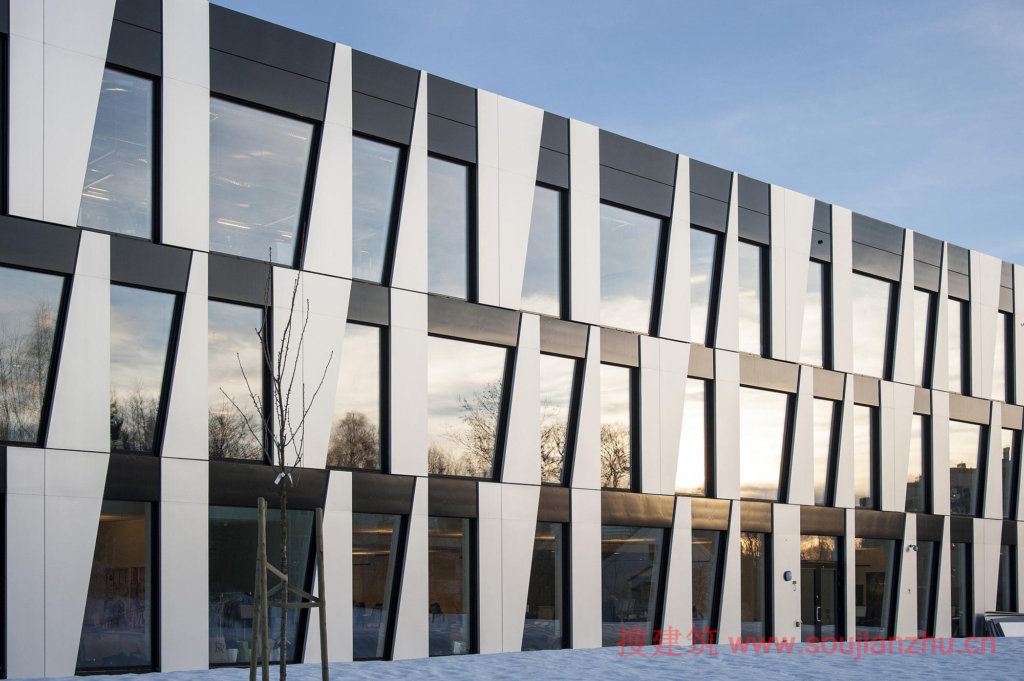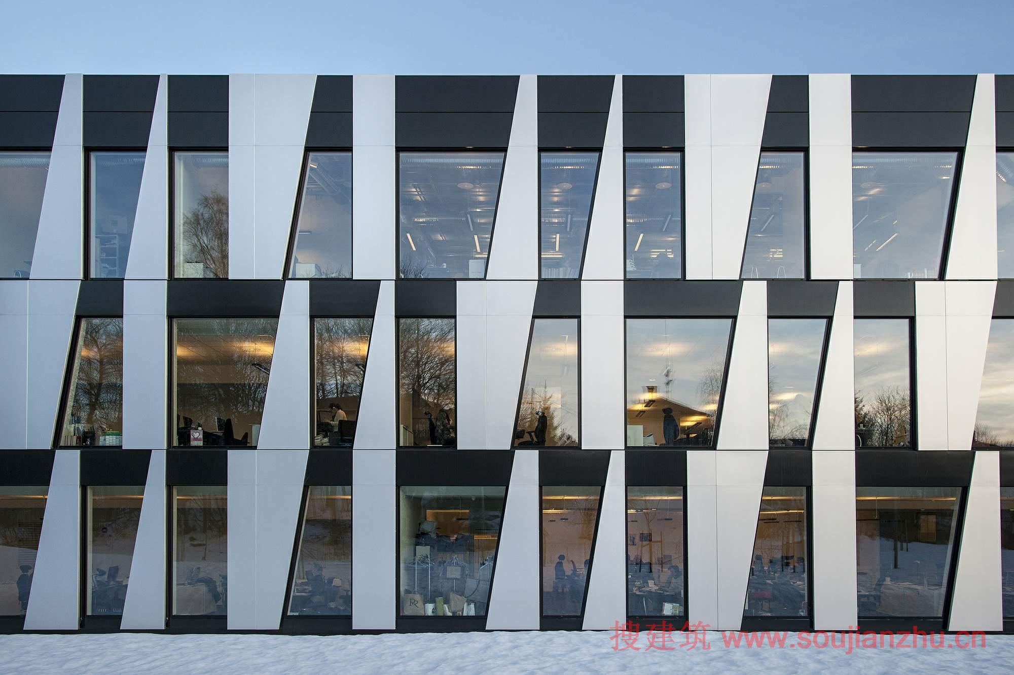 認(rèn)同感,立面提供不僅是一個(gè)外部效應(yīng)。作為一個(gè)結(jié)果,對(duì)角線和不同的模塊的大小,有四種不同的窗口形式。這些大型開放式辦公室內(nèi)景觀以及提供不同的因素為規(guī)模較小的房間沿外墻給一個(gè)俏皮的感覺。