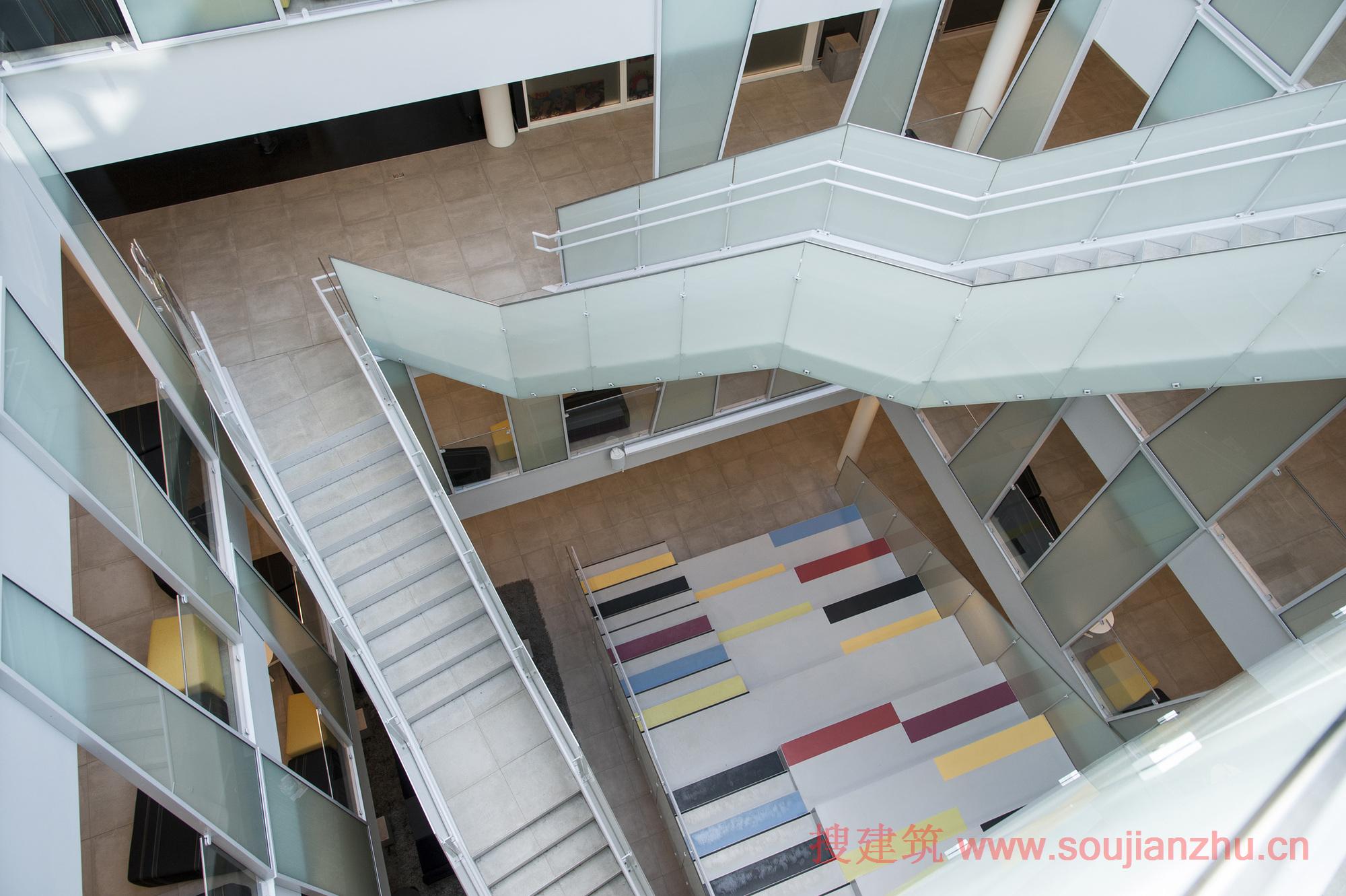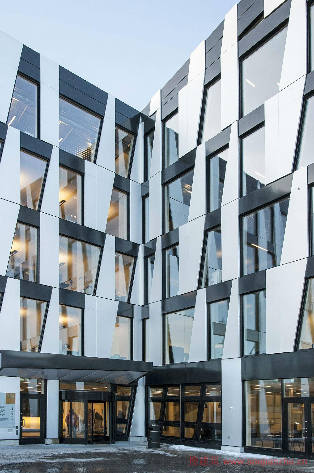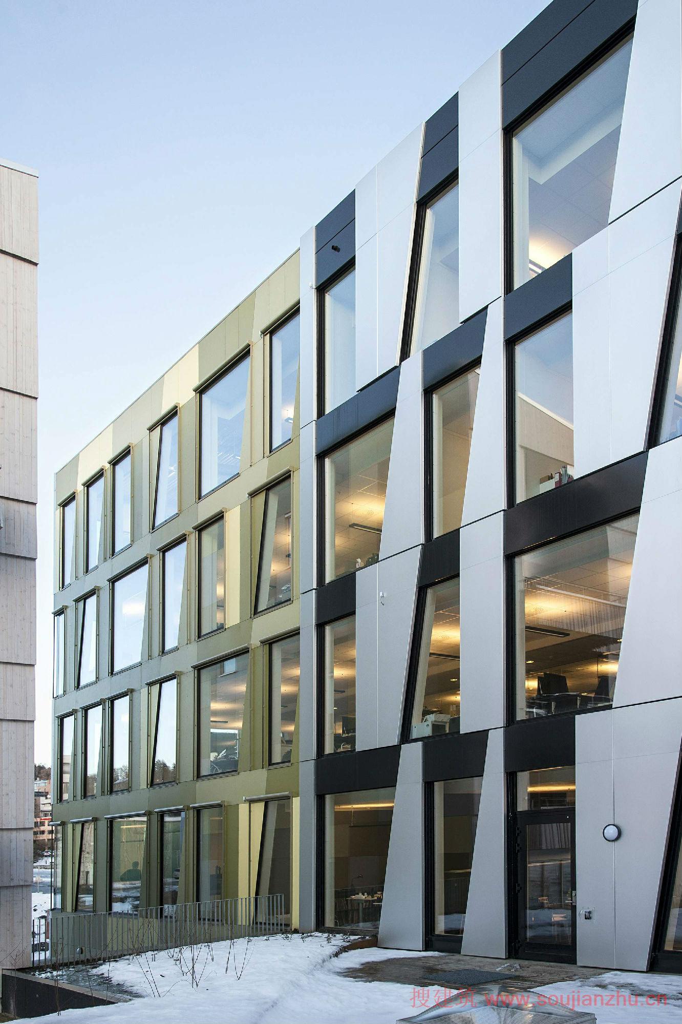 認(rèn)同感,立面提供不僅是一個(gè)外部效應(yīng)。作為一個(gè)結(jié)果,對(duì)角線和不同的模塊的大小,有四種不同的窗口形式。這些大型開放式辦公室內(nèi)景觀以及提供不同的因素為規(guī)模較小的房間沿外墻給一個(gè)俏皮的感覺。