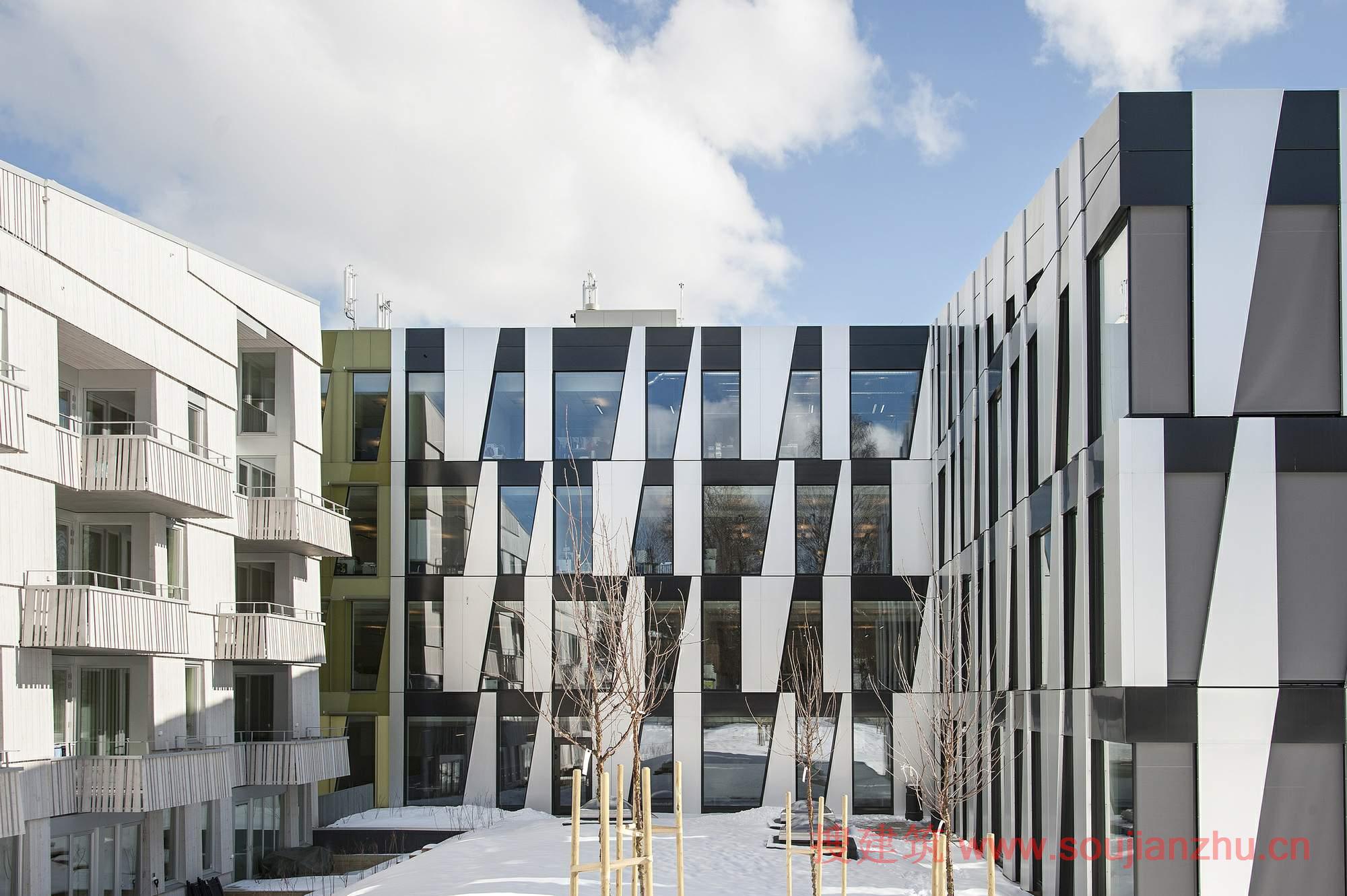 接縫是由單個(gè)體積組成的,每一個(gè)都有強(qiáng)烈的視覺效果。住宅成交量自然木材的重疊板包。三棟辦公樓的設(shè)計(jì)與材料相同的材料–光和亞光天然電化鋁,并結(jié)合黑暗,反射玻璃和金屬漆搭配。每一個(gè)寫字樓的立面有一個(gè)獨(dú)特的幾何結(jié)構(gòu),使它們有一個(gè)單獨(dú)的身份。整體上切掉的地方,創(chuàng)造寫字樓和住宅的建筑體量之間的通道的概念,給出了分段表面暴露的彩色處理。