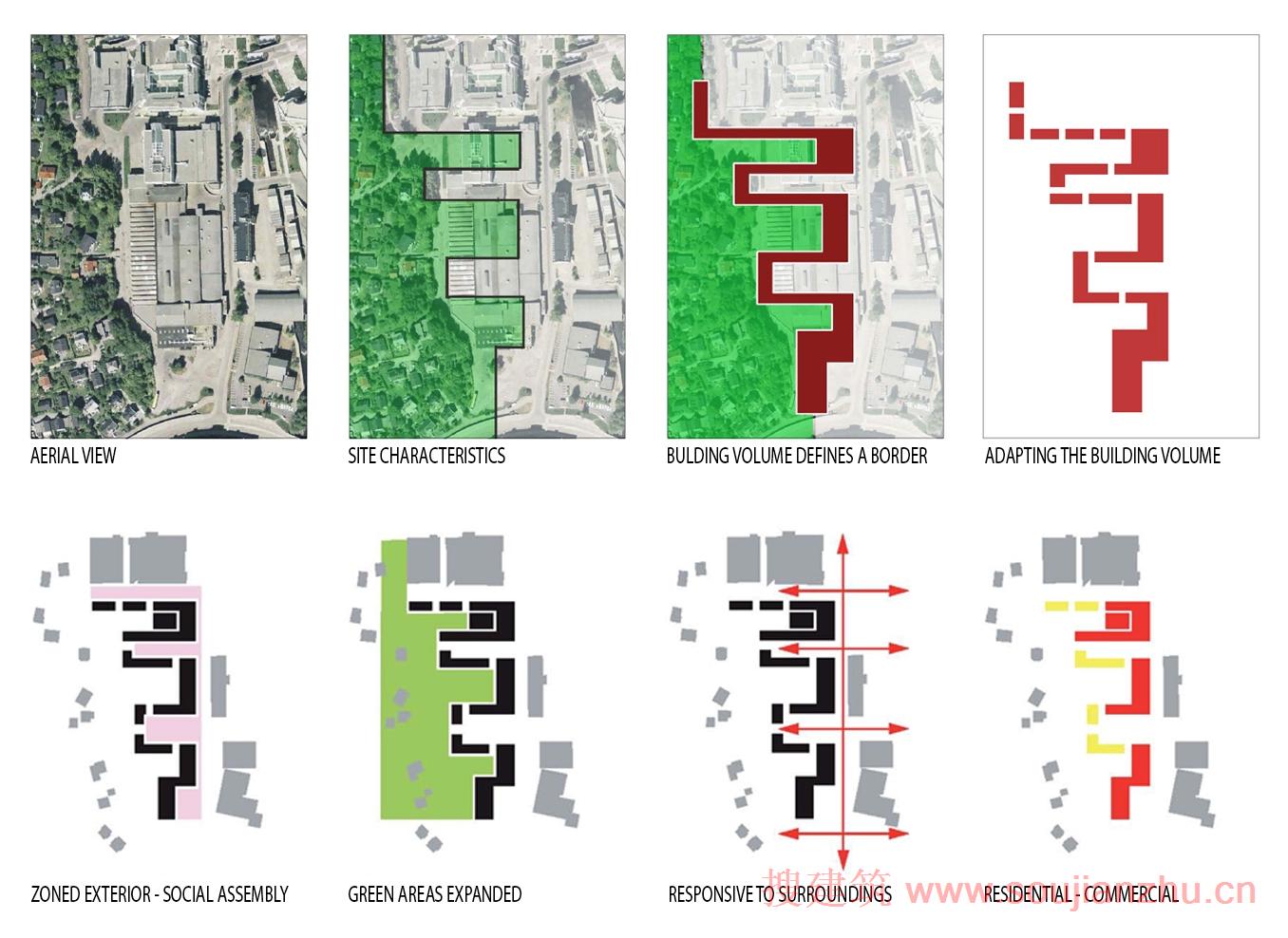 設(shè)計(jì)的概念是一個(gè)重新組成的邊境。在西部,設(shè)計(jì)師加入傳統(tǒng)住宅和花園區(qū)一個(gè)公園。在東部,將新的建筑與現(xiàn)有建筑物,形成街道,平行于Aker河流。項(xiàng)目發(fā)展的兩特征邊縫間東方和西方,縫一條新的生活變成一個(gè)以前的工業(yè)景觀。自然與城市之間的邊界是鉸接在建筑容積為一條曲折的幾何線縫。沿接縫,商業(yè)和住宅建筑之間的功能變換,辦事處向街道和房屋的朝向公園。在新的公共區(qū)域的曲折縫之間的空間展開–城市廣場(chǎng)向街道和郁郁蔥蔥的花園朝向公園。
