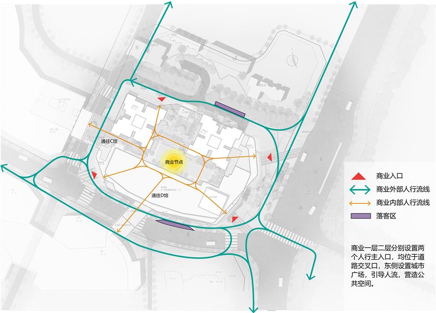 購(gòu)物中心充分考慮周邊人群進(jìn)入的便利性,占足東、西、南向城市界面的同時(shí),向主要人流來(lái)向開設(shè)出入口,并通過(guò)地上地下與C、D館的連接形成“自成核心,多方互聯(lián)”的整體商業(yè)布局。住宅區(qū)將商業(yè)屋頂打造為入戶花園,形成獨(dú)立私密的住區(qū)活動(dòng)空間,最大化商住綜合體的居住價(jià)值。