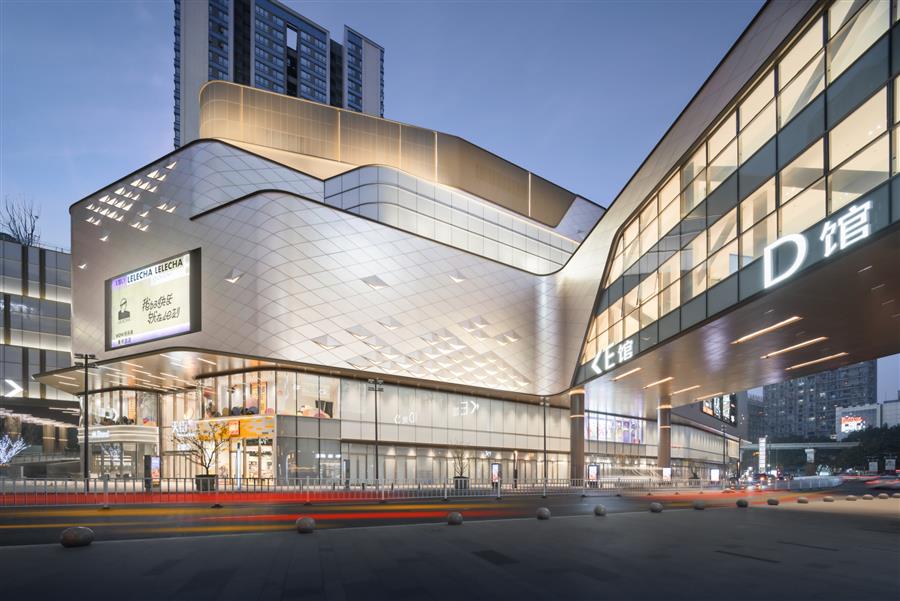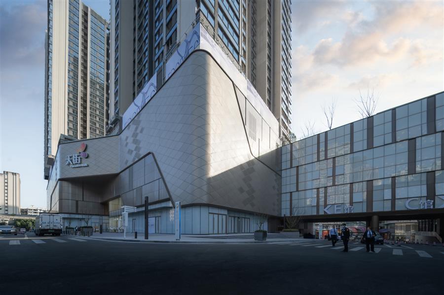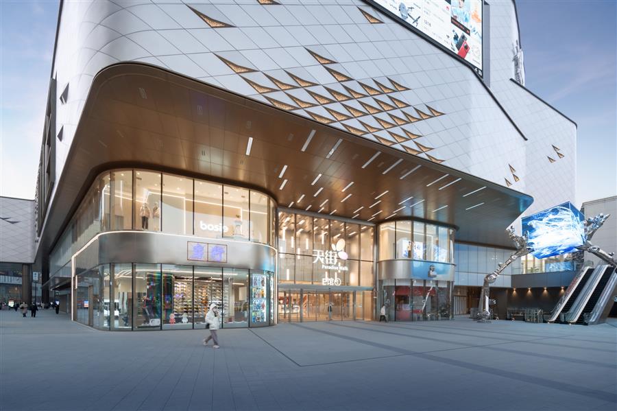 時(shí)代天街作為四期五館的巨型商業(yè)旗艦,通過(guò)商業(yè)島嶼之間的聯(lián)系自成一城,以其巨型體量和高度的功能整合拓展城市公共空間,豐富游人的體驗(yàn)感和參與感,連續(xù)的空間,起伏的造型,變化的細(xì)部,令視覺驚喜不斷。