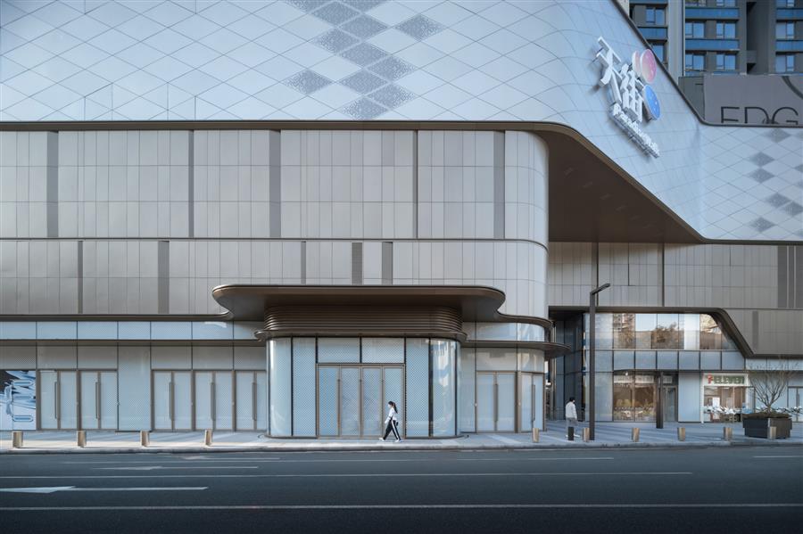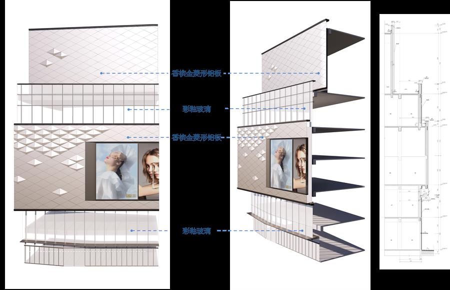香檳金菱形鋁板仿佛凹凸鱗片,配合燈光提升建筑立面的辨識(shí)度,溫和的顏色在日光下與城市融合,消解巨大體量帶來(lái)的壓迫感。后勤區(qū)使用彩釉玻璃,呼應(yīng)主體元素。彩釉玻璃遮陽(yáng)效果明顯,將后勤區(qū)與商業(yè)區(qū)從立面分隔,保持了外觀視覺上的精致統(tǒng)一。