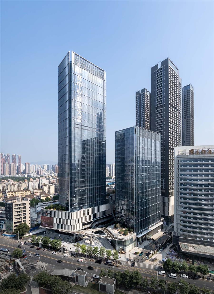 MixC Sungang引人注目的正面是一個(gè)雕塑般的不銹鋼頂棚,將游客拉入步行商業(yè)街,為購(gòu)物者和食客創(chuàng)造一個(gè)充滿活力的林蔭道。