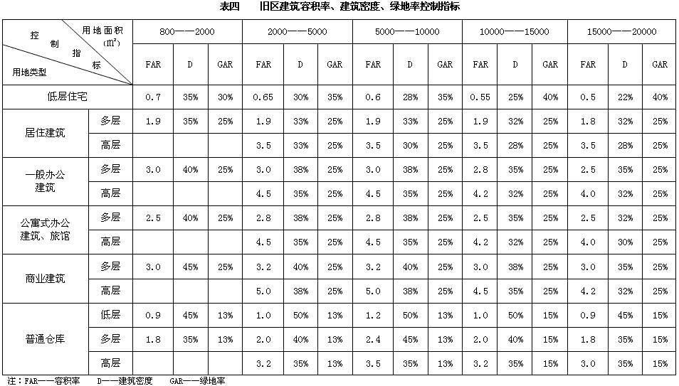 第十八條 建設(shè)用地面積小于20000平方米,按《中華人民共和國城鄉(xiāng)規(guī)劃法》及《龍巖中心城市規(guī)劃管理規(guī)定(暫行)》執(zhí)行,其控制指標(biāo)應(yīng)按表三、表四、表五的規(guī)定執(zhí)行。表三、表四中建筑密度、容積率為上限,是強(qiáng)制性指標(biāo);綠地率為下限,是強(qiáng)制性指標(biāo)。