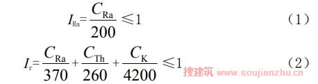 6 當成品住宅工程場地土壤氡濃度平均值不小于50000Bq/m3或土壤表面氡析出率平均值不小于0.3Bq/(㎡?s)時,應進行工程場地土壤中的鐳-226、釷-232、鉀-40比活度測定。當土壤內(nèi)照射指數(shù)(IRa)大于1.0或外照射指數(shù)(Iγ)大于1.3時,工程場地土壤不得作為工程回填土使用。