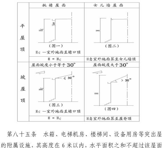 第八十四條 建筑高度是指建筑物室外地坪至檐口、女兒墻或屋脊頂?shù)拇怪本嚯x。其計(jì)算方式如下(詳見(jiàn)圖6-1):