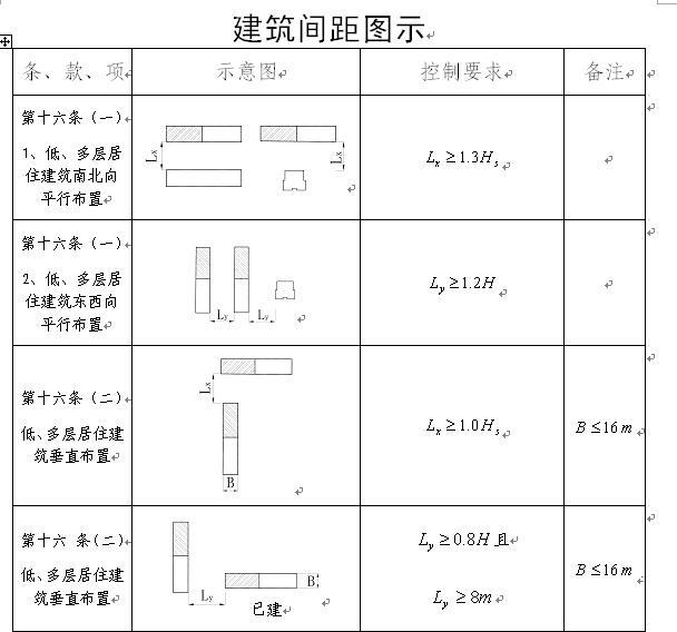 第十六條 居住建筑的建筑間距應(yīng)滿(mǎn)足國(guó)家有關(guān)日照間距的規(guī)定。根據(jù)日照、通風(fēng)的基本要求和本市用地的實(shí)際情況,低、多層居住建筑的建筑間距必須符合下列規(guī)定: