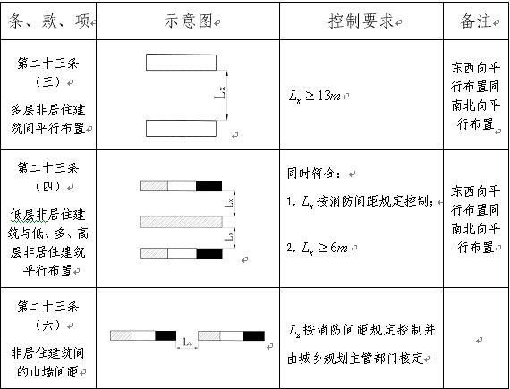 第二十三條 非居住建筑間的建筑間距,除工業(yè)生產(chǎn)性用房和倉(cāng)儲(chǔ)用房的間距可按消防間距的規(guī)定控制外,必須符合下列規(guī)定。