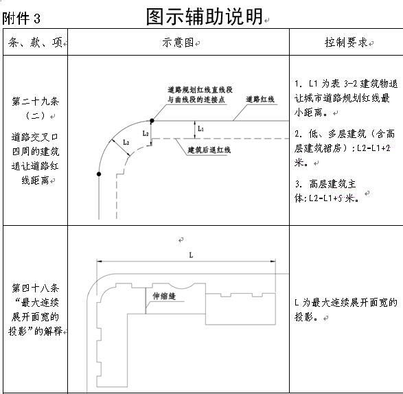 (二)道路交叉口四周的建筑退讓道路紅線(xiàn)距離,在表3-2規(guī)定的退距的基礎(chǔ)上,低、多層建筑(含高層建筑裙房)增加2米,高層建筑主體增加5米(均自道路規(guī)劃紅線(xiàn)直線(xiàn)段與曲線(xiàn)段的連接點(diǎn)算起)。