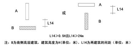 第十九條 高層居住建筑與其他居住建筑的間距,應(yīng)保證受遮擋的居住建筑的居室大寒日滿(mǎn)窗日照的有效時(shí)間不少于三小時(shí),并應(yīng)符合下列規(guī)定: