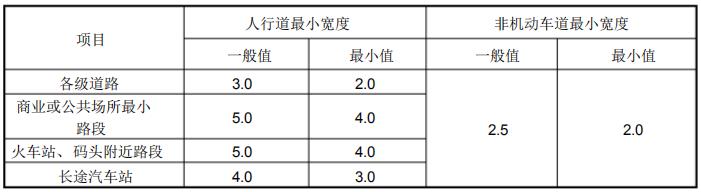 人行道、非機(jī)動(dòng)車(chē)道最小寬度(單位: m)