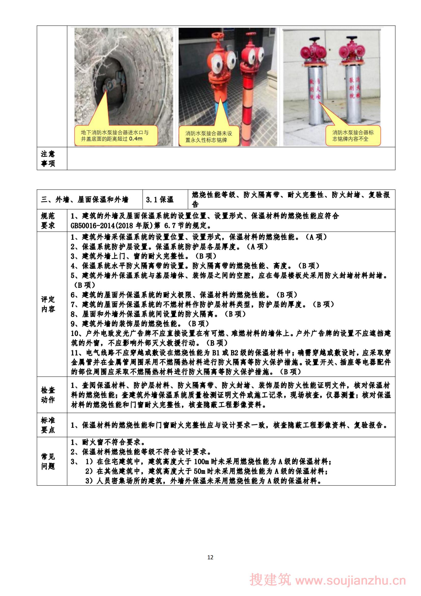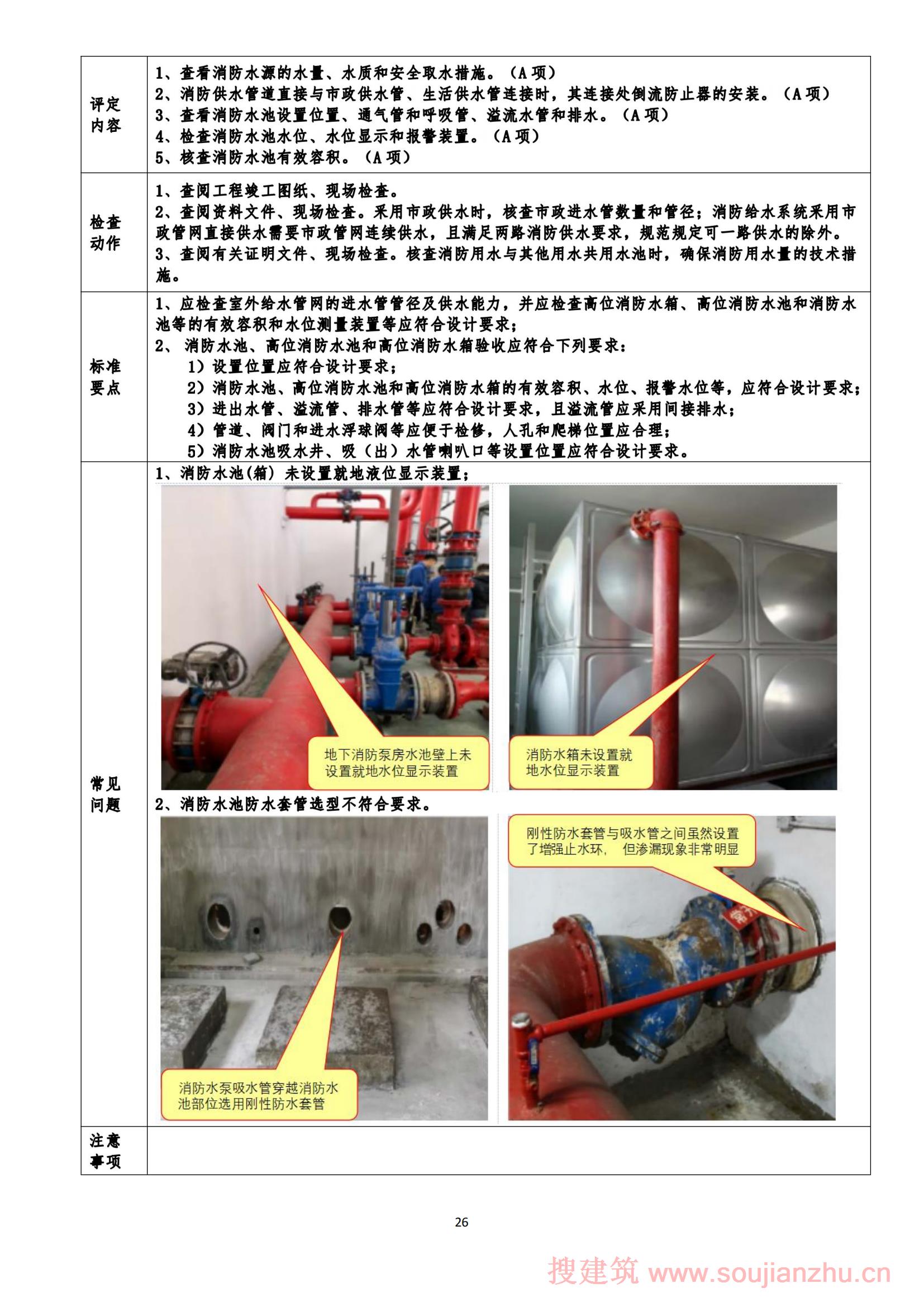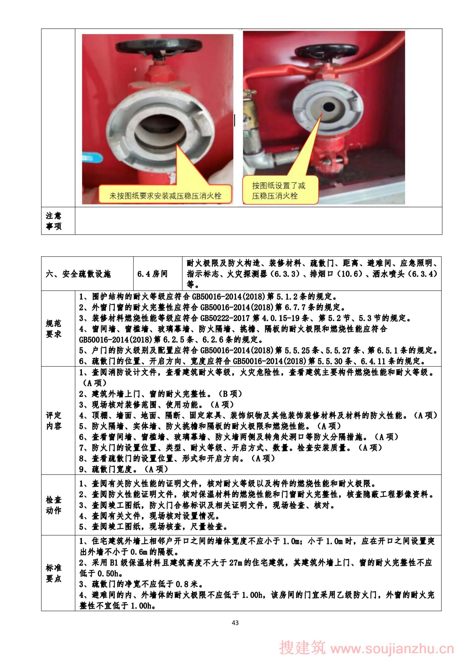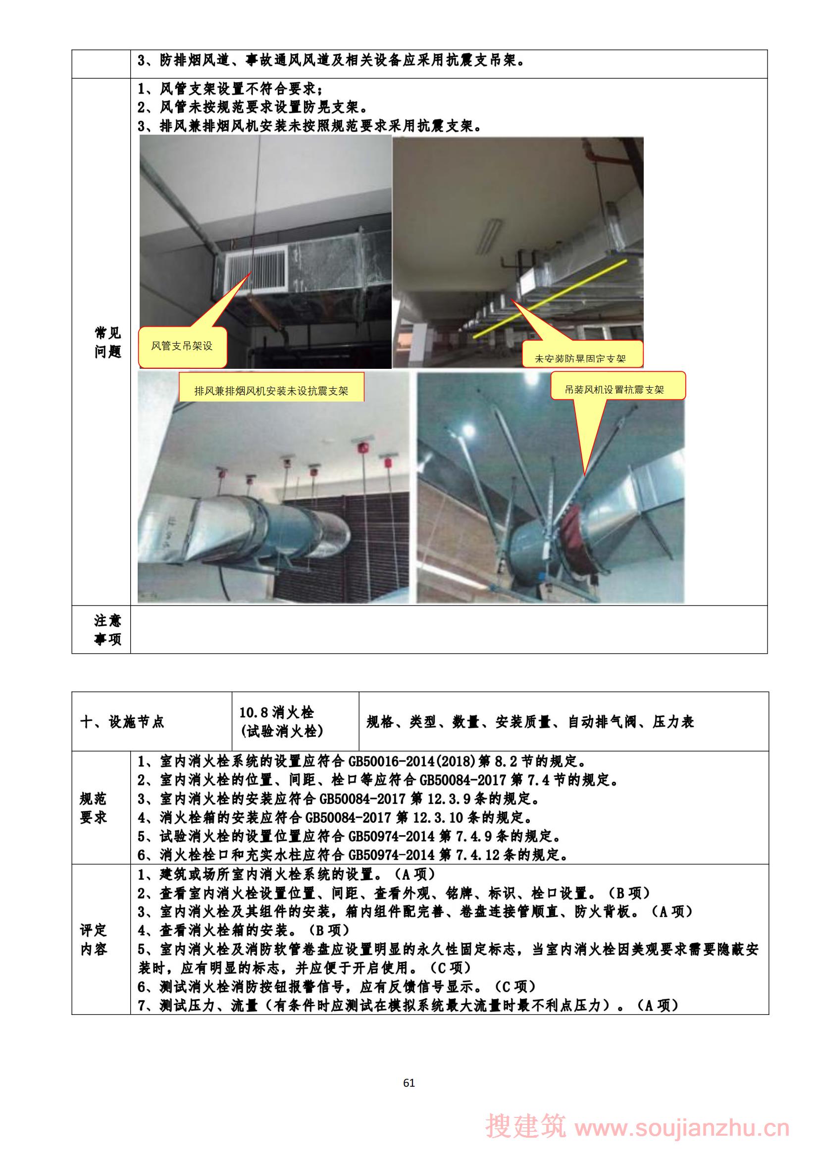 本手冊(cè)按先會(huì)議室查閱資料核對(duì)后去現(xiàn)場查看測試,先室外后室內(nèi),先公共設(shè)備用房后樓層消防設(shè)備房,先地下樓層(含公共設(shè)備用房)后首層、減壓分區(qū)層、標(biāo)準(zhǔn)層、頂層、屋頂層的路徑原則進(jìn)行組織驗(yàn)收,對(duì)驗(yàn)收部位涉及到的全專業(yè)消防設(shè)施進(jìn)行評(píng)定。共分為三個(gè)章節(jié):第一章,常用工作程序和常用路徑介紹,第二章,驗(yàn)收部位、節(jié)點(diǎn)表;第三章,消防驗(yàn)收部位相關(guān)的規(guī)范要求、評(píng)定內(nèi)容、檢查動(dòng)作、標(biāo)準(zhǔn)要點(diǎn)、常見問題、注意事項(xiàng)等內(nèi)容進(jìn)行匯總,給消防驗(yàn)收人員提供參考。