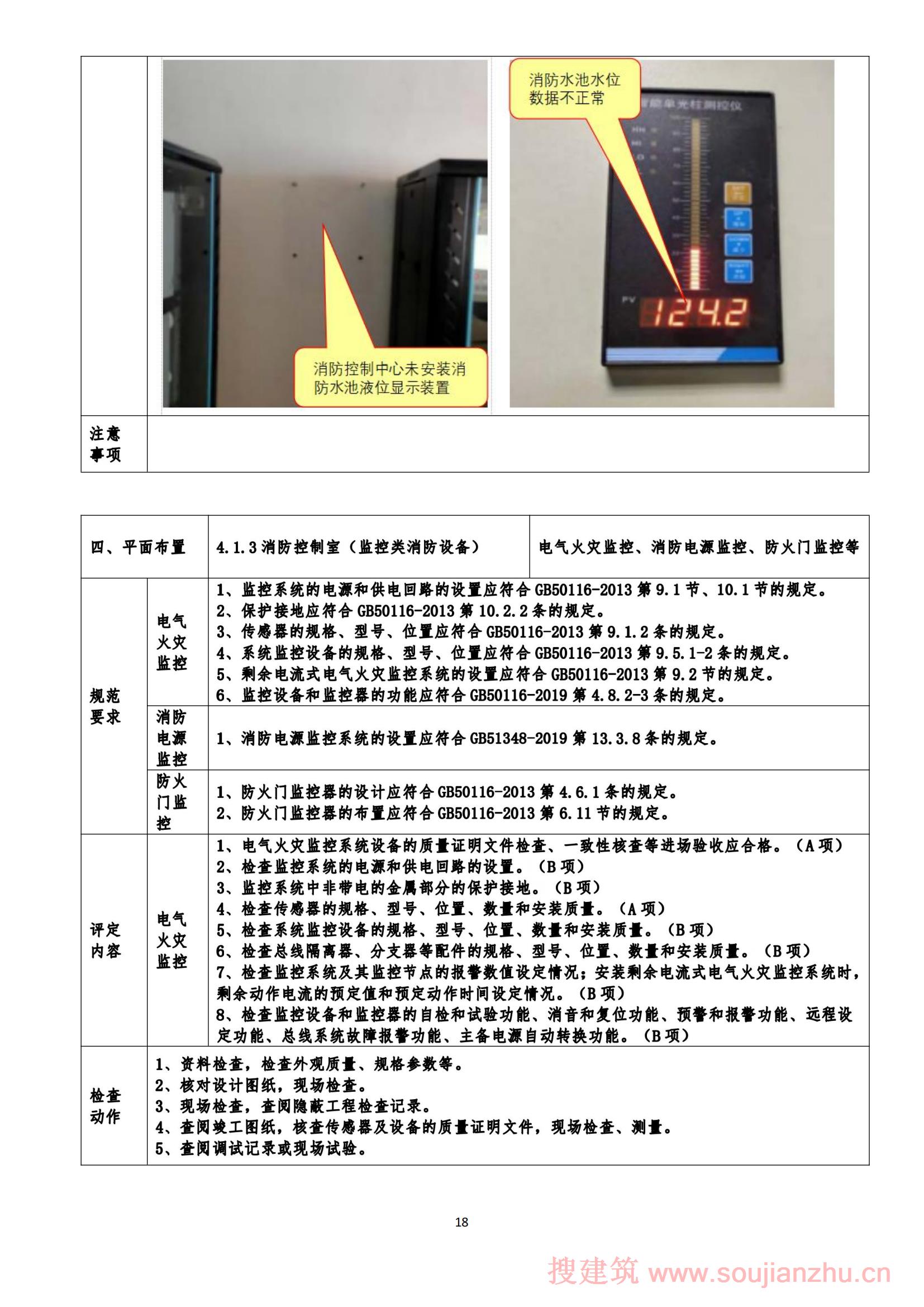 建筑總平面、室外消防設(shè)施:對(duì)照?qǐng)D紙全數(shù)測量核對(duì)防火間距、消防車道、回車場、消防車登高操作場地,建筑外立面的消防救援窗口、建筑外墻保溫系統(tǒng)、外裝飾材料等;對(duì)照?qǐng)D紙查看市政進(jìn)水情況,核查室外消火栓、水泵接合器、取水口等,測量相關(guān)距高、管徑、室外環(huán)狀管網(wǎng)等,測試消防設(shè)施的功能并核對(duì)性能參數(shù)等。